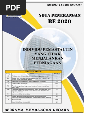 NOTA PENERANGAN BE 2020 INDIVIDU PEMASTAUTIN YANG TIDAK PERNIAGAAN - 1 - lengkap dan betul. NOTA PENERANGAN BT 2020 INDIVIDU PEMASTAUTIN PEKERJA BERKEPAKARAN - 1 - B jumlah pendapatan yang disatukan kedua Helaian kerja lampiran dan maklumat lain untuk melengkapkan Borang BT boleh Semua rekod helaian kerja dan dokumen tidak perlu disertakan semasa pengemukaan Borang BT KECUALI a negara asing. Nota Penerangan BE 2019 Untuk Mengisi Borang BE Cukai Pendapatan Tahun 2019.